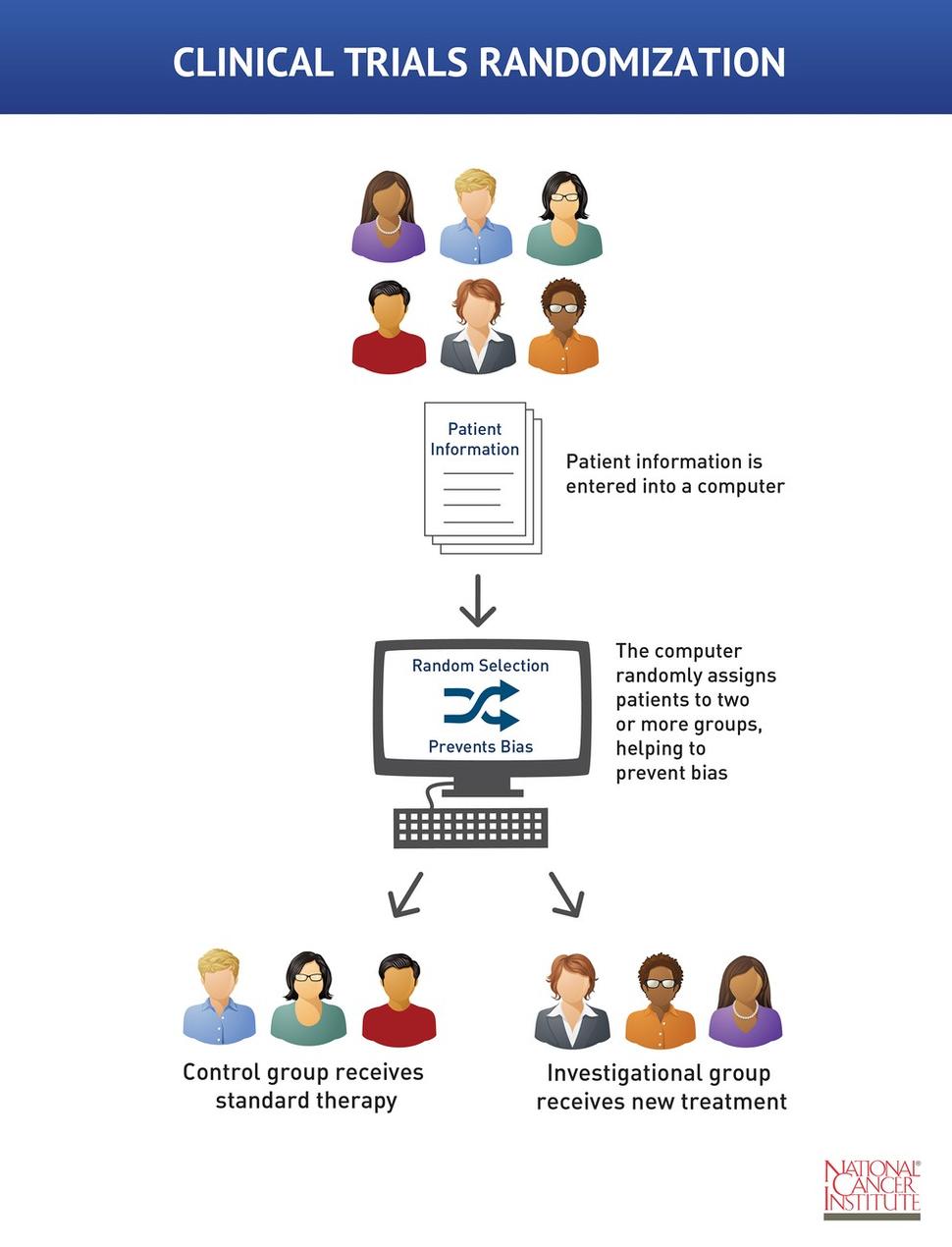 Clinical trial randomization is the process of assigning patients by chance to groups that receive different treatments. In the simplest trial design, the investigational group receives the new treatment and the control group receives standard therapy. At several points during and at the end of the clinical trial, researchers compare the groups to see which treatment is more effective or has fewer side effects.