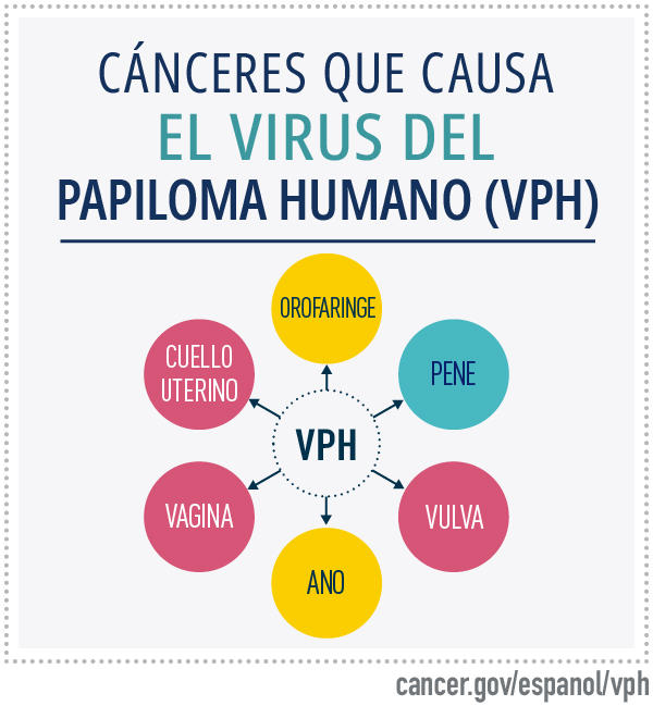 El VPH causa seis tipos de cáncer: cáncer de ano, cáncer de cuello uterino, cáncer de orofaringe, cáncer de pene, cáncer de vagina y cáncer de vulva.