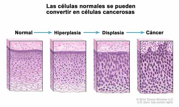 - Displasia: afección más avanzada que la hiperplasia. En la displasia, también se acumulan demasiadas células. Pero las células se ven anormales y cambia la estructura del tejido. En general, mientras más anormal se vean las células y el tejido, más probable es que se convierta en cáncer. Algunos tipos de displasia se deben vigilar o tratar y otros no. Un ejemplo de displasia es el nevo displásico, un tipo de lunar anormal que aparece en la piel. Aunque en la mayoría de los casos no ocurre, a veces el nevo displásico se convierte en melanoma, un tipo de cáncer de piel.