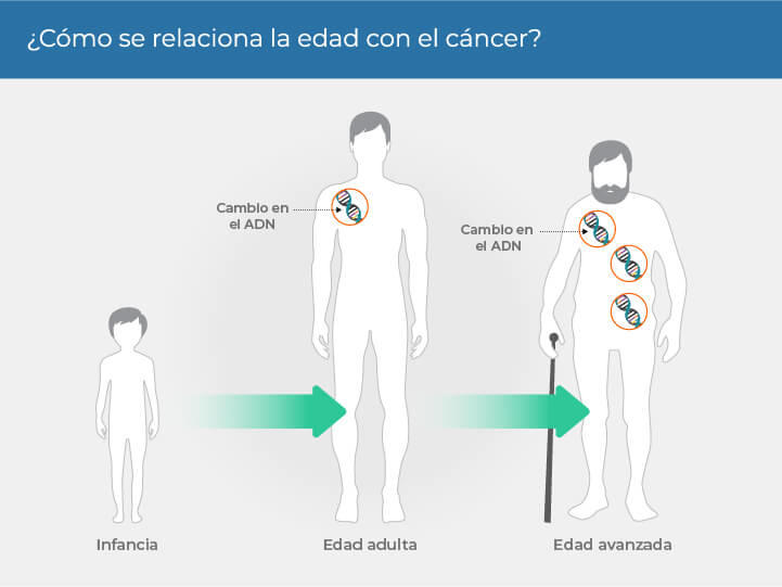 En general, el cuerpo elimina células con daños en el ADN antes de que se vuelvan cancerosas. Pero la capacidad del cuerpo disminuye a medida que las personas envejecen. Por eso el riesgo de cáncer aumenta con la edad.