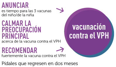 Hay formas eficientes que no se llevan nada de tiempo para que los proveedores de atención primaria recomienden la vacunación contra el VPH. Una forma aceptada por muchos es hacer saber al papá o a la mamá, durante la consulta, que es tiempo para que su hijo o hija reciba tres vacunas, poniendo a la vacuna contra el VPH en medio de la lista, y luego decir que las vacunas se pondrán al final de la consulta.