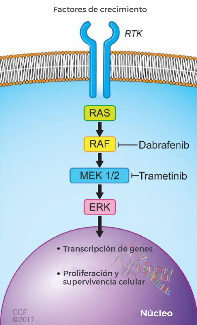 A fin de que los pacientes puedan recibir la combinación de dabrafenib y trametinib para cualquiera de los dos tipos de cáncer, sus tumores deben tener una mutación específica en un gen denominado BRAF. Esta mutación, llamada BRAF V600, puede aumentar el crecimiento y la diseminación de las células cancerosas.