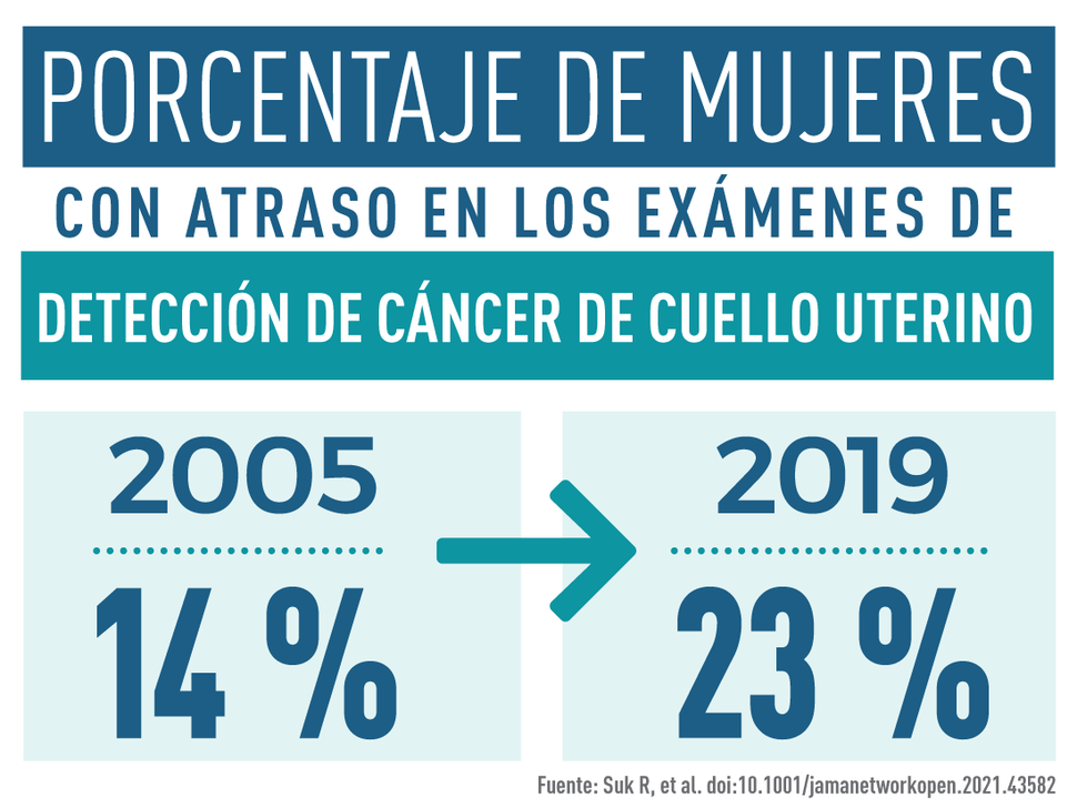 Con los exámenes de detección de cáncer de cuello uterino se disminuyó muchísimo el número de casos nuevos y de muertes por la enfermedad en los últimos 50 años. Sin embargo, el porcentaje de mujeres en los Estados Unidos que están atrasadas con los exámenes de detección de cáncer de cuello uterino está en aumento, y no queda claro por qué.
