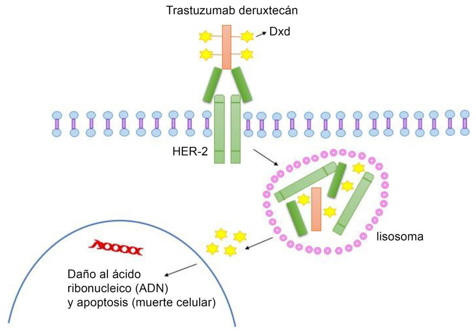El componente de trastuzumab en T-DXd actúa como un dispositivo de búsqueda que ayuda al medicamento a liberar la carga de quimioterapia directamente en las células tumorales que tienen HER2 en su superficie. Luego, el conjugado anticuerpo-fármaco entra a la célula, donde se libera el medicamento quimioterapéutico que destruye la célula.