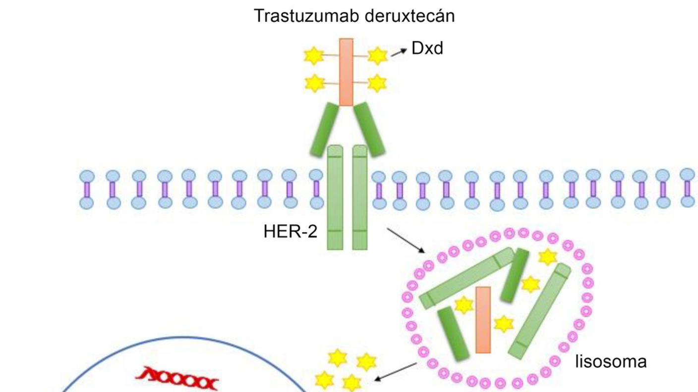 En el caso del T-DXd, el trastuzumab funciona mediante una unión química con el deruxtecán, un medicamento quimioterapéutico. La tarea del trastuzumab en el T-DXd es ser el conductor que entrega el medicamento al destino final: las células que tienen HER2 en la superficie. Después de unirse a la HER2, el medicamento ingresa entero a la célula y libera la carga, el deruxtecán, para destruir la célula.