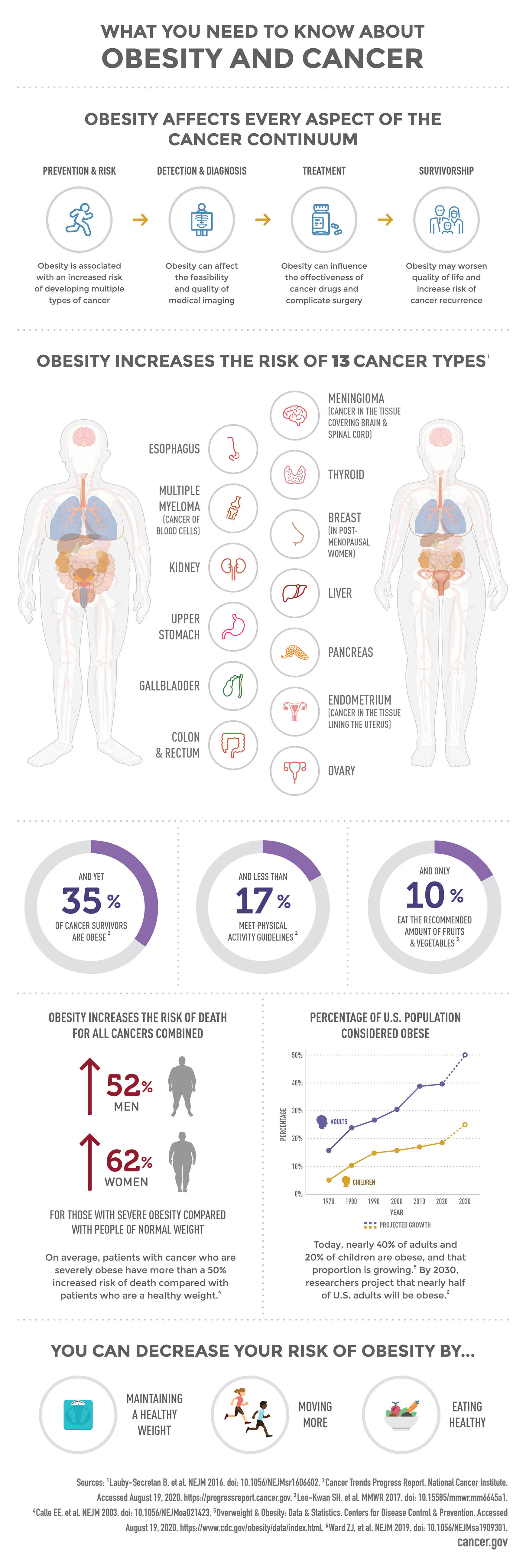 Obesity is a disease that affects all aspects of the cancer continuum, including cancer risk, cancer detection and diagnosis, response to cancer treatment, and survivorship. By 2030, researchers project that obesity will affect nearly half of US adults. Without intervention, the obesity epidemic will result in more cancers.