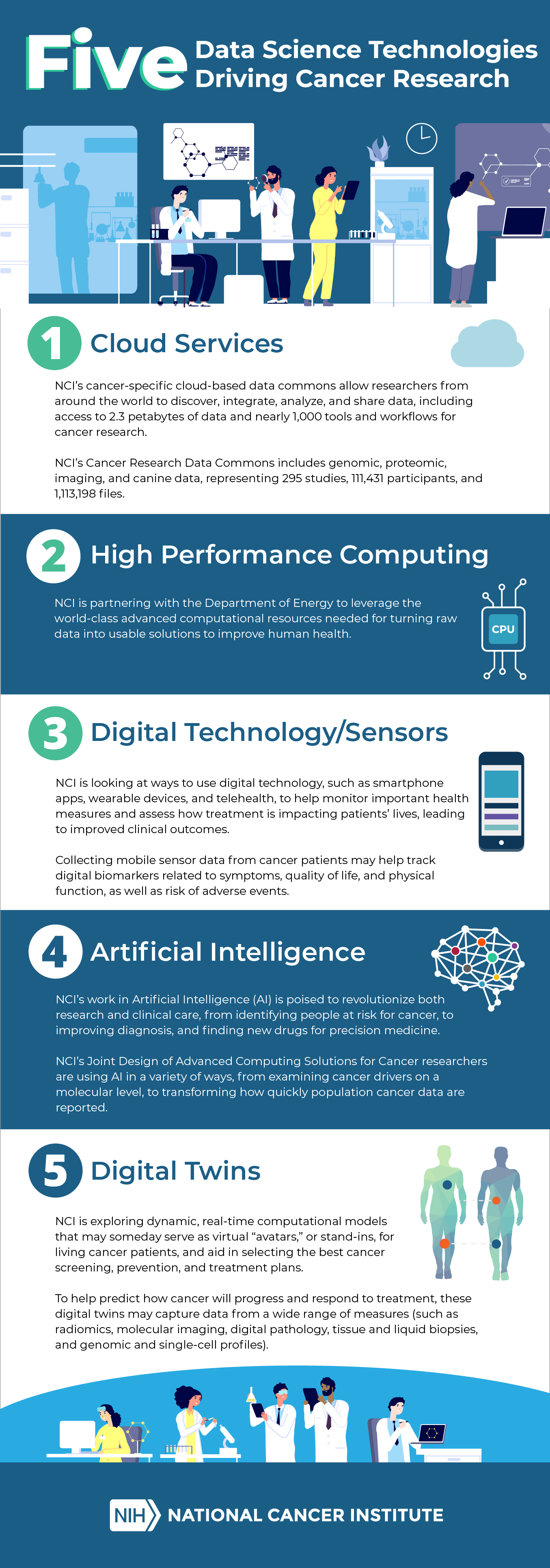 Advances in data science are transforming cancer research and care through five key technologies. Together, these technologies are helping researchers collect, share, and analyze vast amounts of data more efficiently, leading to faster discoveries and more precise insights.